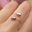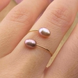 “A delicate adjustable ring crafted from fine golden stainless steel, adorned with a soft pink freshwater pearl. Elegant and minimalistic, it’s a timeless piece that adds a subtle touch of sophistication to any look.”